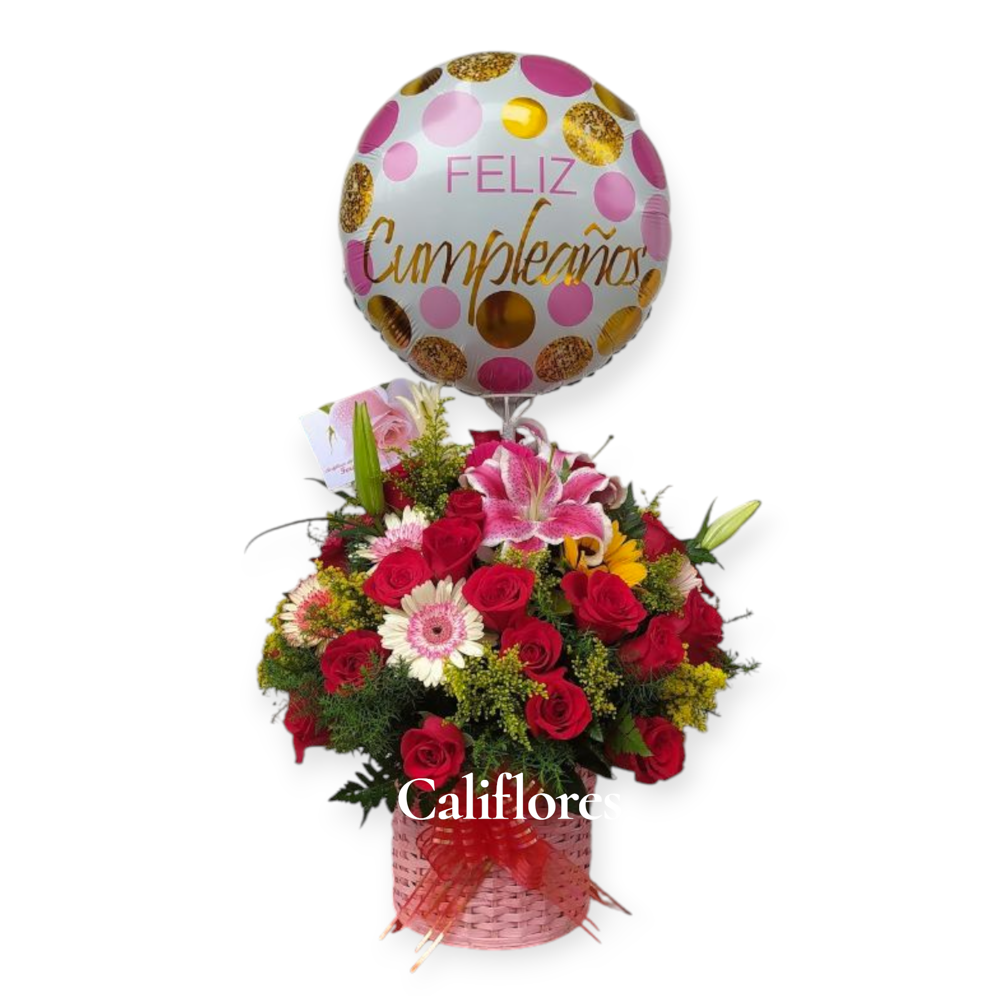 Arreglo redondo con flores surtidas base en canasta moño y globo