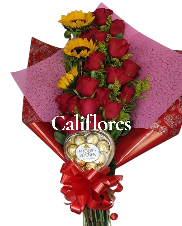 Elaborado en rosas, girasoles y chocolates con su respectivo follaje y empaque