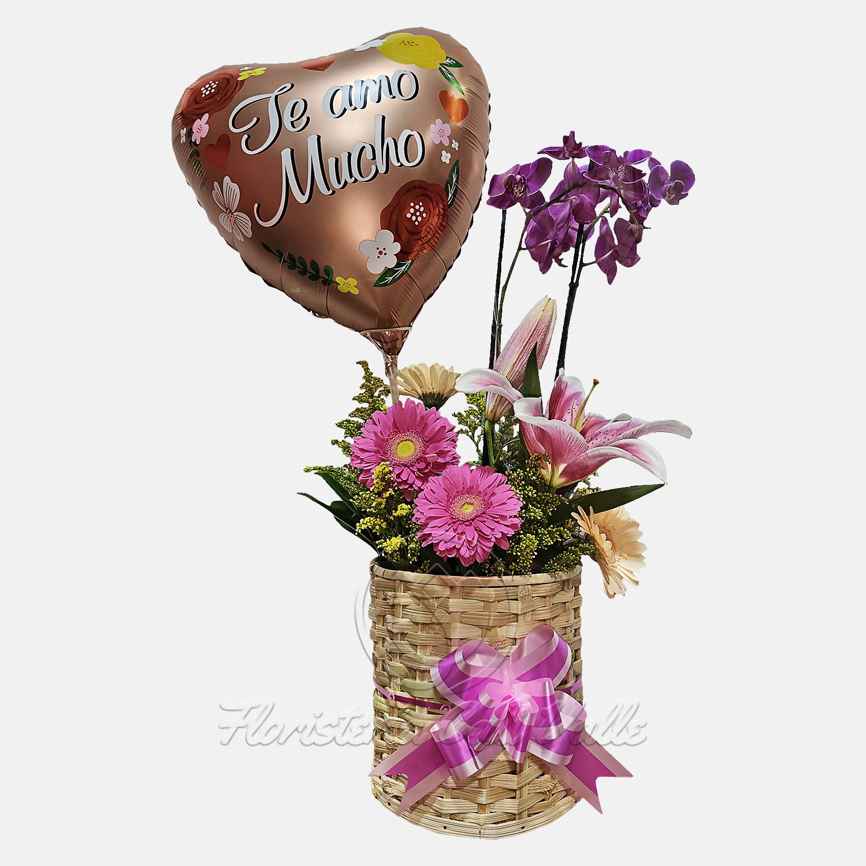 Expresa tus sentimientos más profundos con este elegante arreglo en cesta de mimbre. Una combinación premium de orquídeas púrpuras, gerberas vibrantes y lilium, coronada con un globo de helio metalizado que dice «Te amo mucho». Es el detalle perfecto para aniversarios o momentos inolvidables.