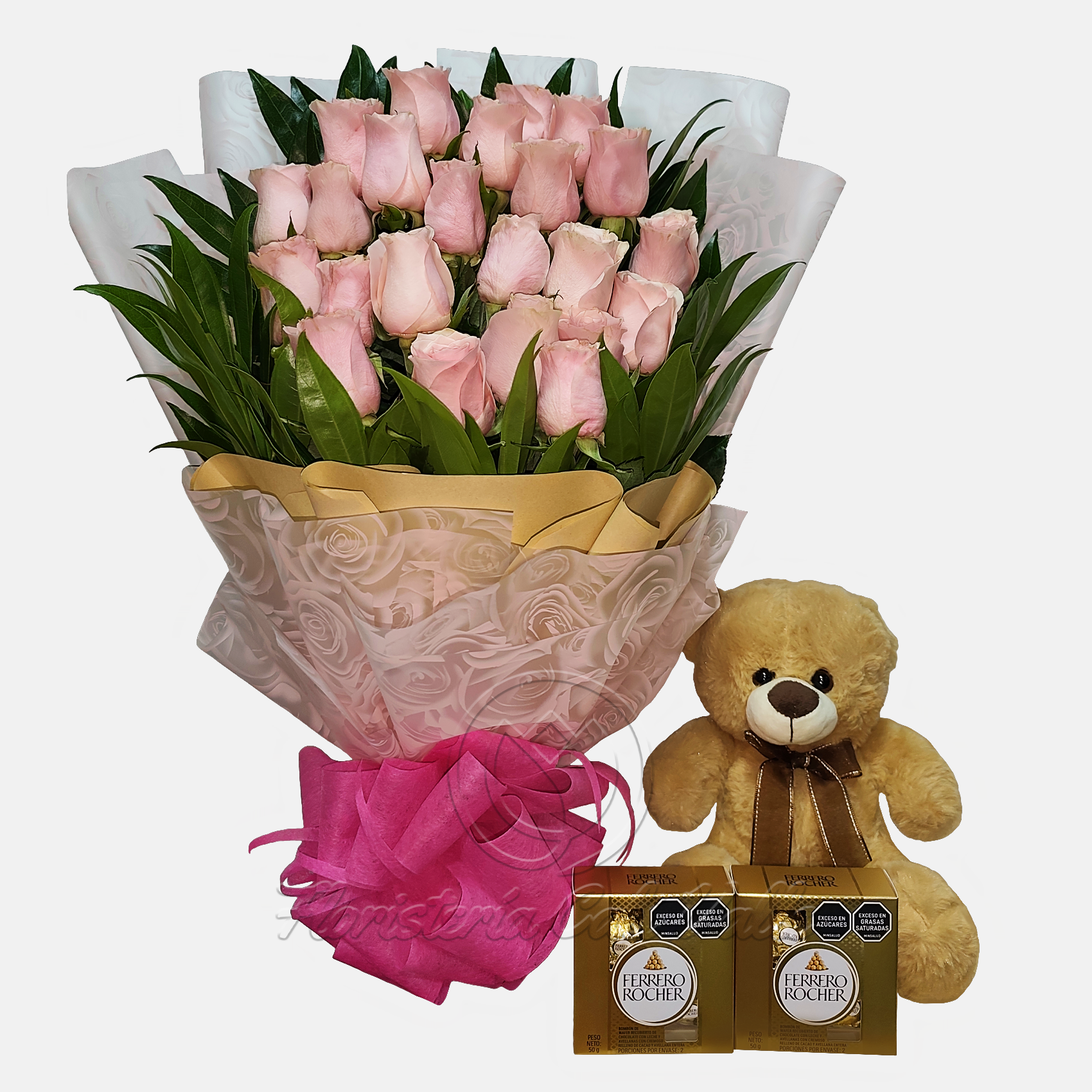 Este encantador conjunto está diseñado para cautivar los sentidos y expresar los sentimientos más dulces, combinando la elegancia de un ramo de rosas rosadas premium con la calidez de un suave oso de peluche y el exquisito sabor de los bombones Ferrero Rocher. Presentado con un envoltorio artístico y un lazo decorativo, es el regalo perfecto para celebrar aniversarios, cumpleaños o simplemente para recordar a alguien especial cuánto le aprecias con un gesto que llega directo al corazón.