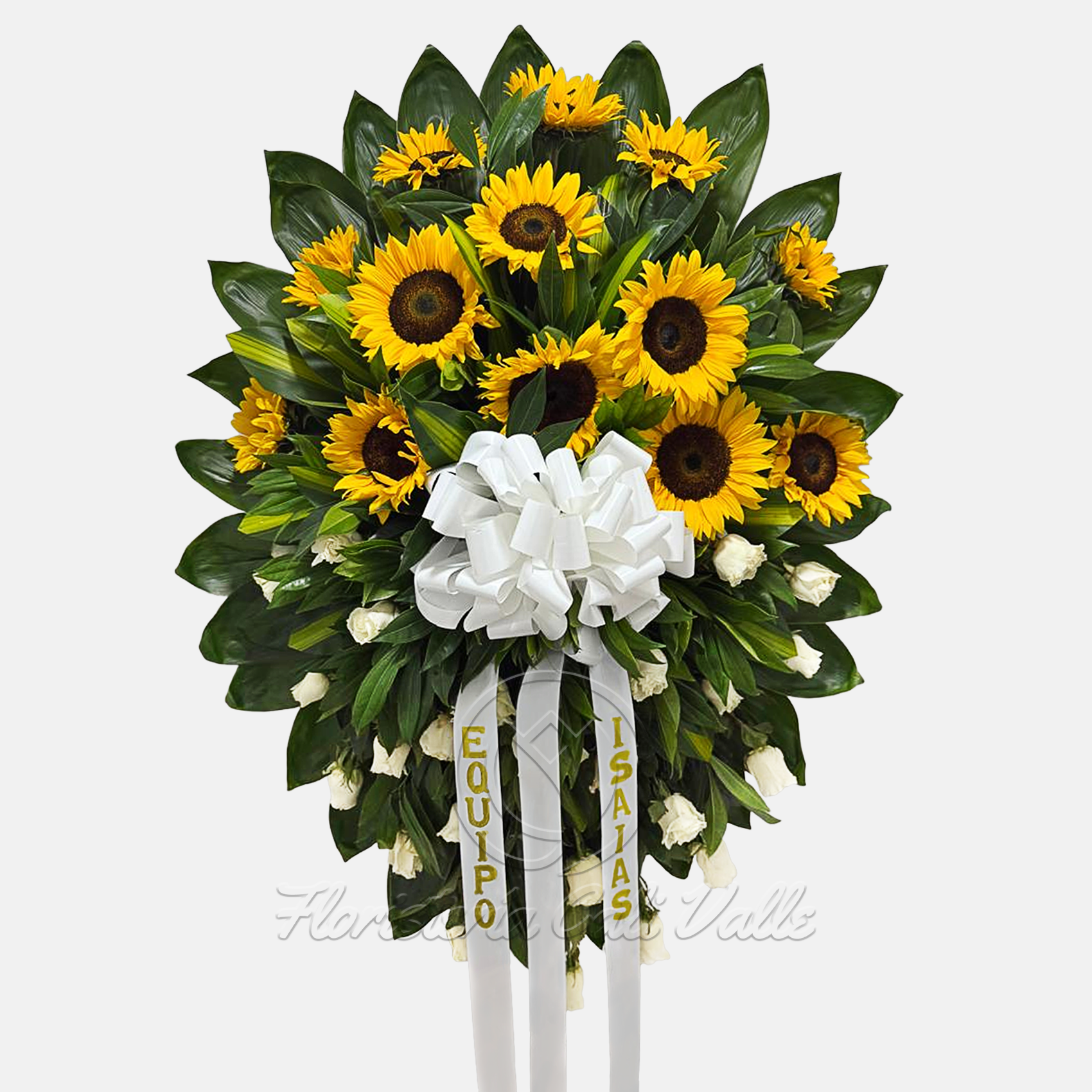 Este distinguido crestón fúnebre destaca por su diseño cálido y reconfortante, centrado en la luminosidad de los girasoles que simbolizan la vida y el recuerdo eterno. La composición se complementa armoniosamente con delicadas rosas blancas y un follaje verde profundo que aporta cuerpo y elegancia al conjunto. El arreglo está coronado por un gran lazo blanco de seda y cintas colgantes personalizables en letras doradas, ideales para plasmar nombres o mensajes de apoyo. Es una elección excepcional para quienes desean rendir un homenaje lleno de luz y serenidad en salas velatorias, destacando por su frescura, calidad artesanal y una imponente presencia que brinda consuelo a los seres queridos.