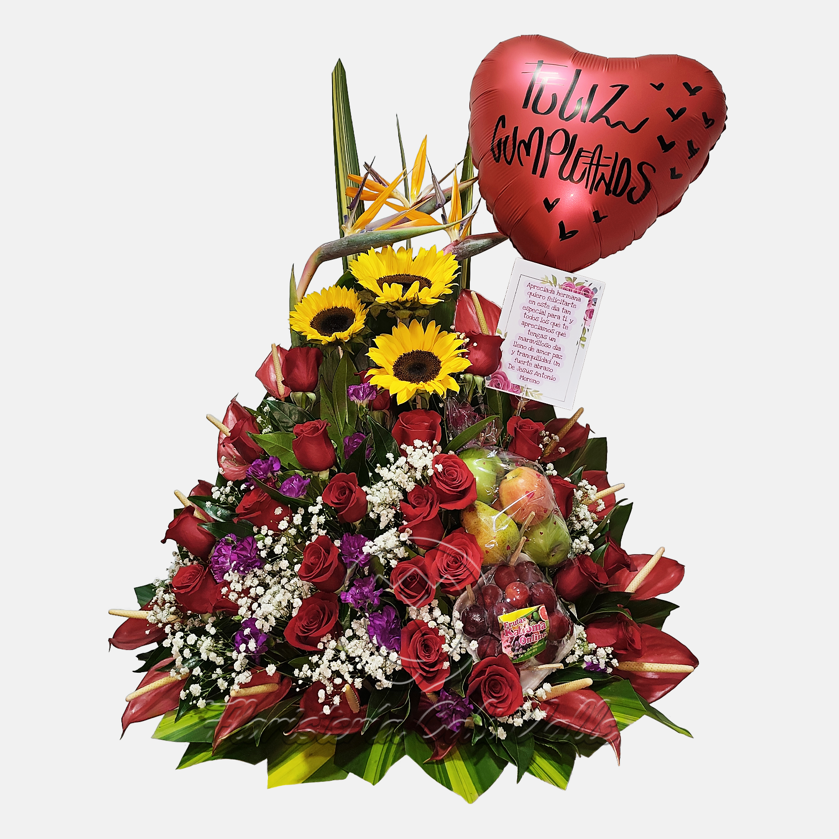 Un imponente y vibrante arreglo diseñado para desear un Feliz Cumpleaños de manera inolvidable. Presenta una mezcla dramática de flores: la pasión de las rosas rojas y fucsias, la alegría de los girasoles, la elegancia de los lirios y toques de flores exóticas como las Aves del Paraíso y los Anturios. El arreglo está coronado por un festivo globo de corazón rojo con la frase «Feliz Cumpleaños», creando una presentación alta, rica en texturas y colores.