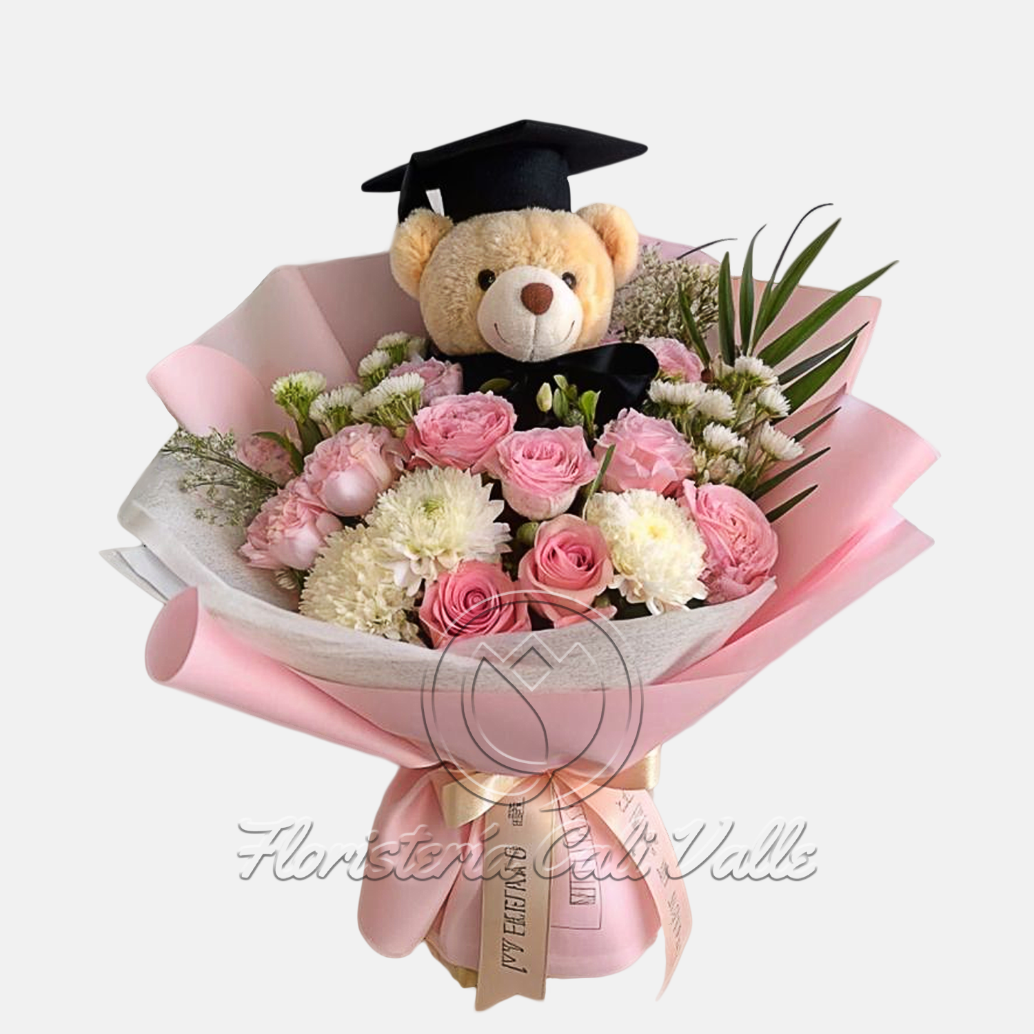 Un tierno y elegante ramo diseñado para celebrar un logro académico importante. Presenta una armoniosa mezcla de rosas rosadas (que simbolizan la admiración) y crisantemos blancos y crema, que añaden textura y volumen. El toque central es un adorable osito de peluche vestido con toga y birrete de graduación. El ramo está envuelto en papel de seda en dos tonos de rosa y blanco, y adornado con un lazo elegante, convirtiéndolo en el regalo perfecto para felicitar a un recién graduado.