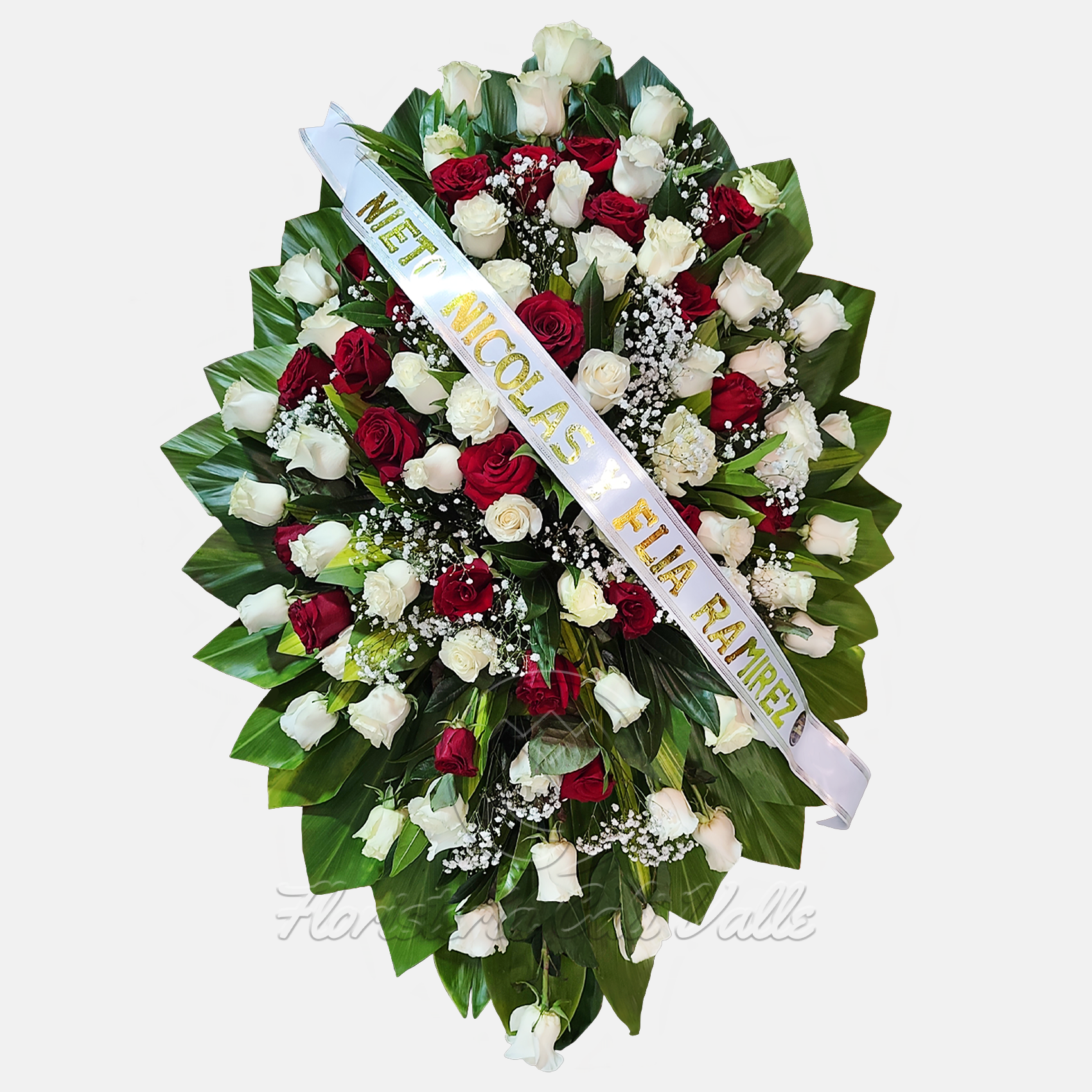 Este majestuoso arreglo fúnebre está diseñado con una selección premium de rosas rojas y blancas, símbolos de amor eterno y paz profunda, dispuestas armoniosamente sobre un follaje verde intenso que realza su elegancia. La combinación de colores ofrece un tributo visualmente impactante y sobrio, ideal para expresar condolencias sinceras y acompañar a las familias en momentos de despedida con la dignidad que su ser querido merece.