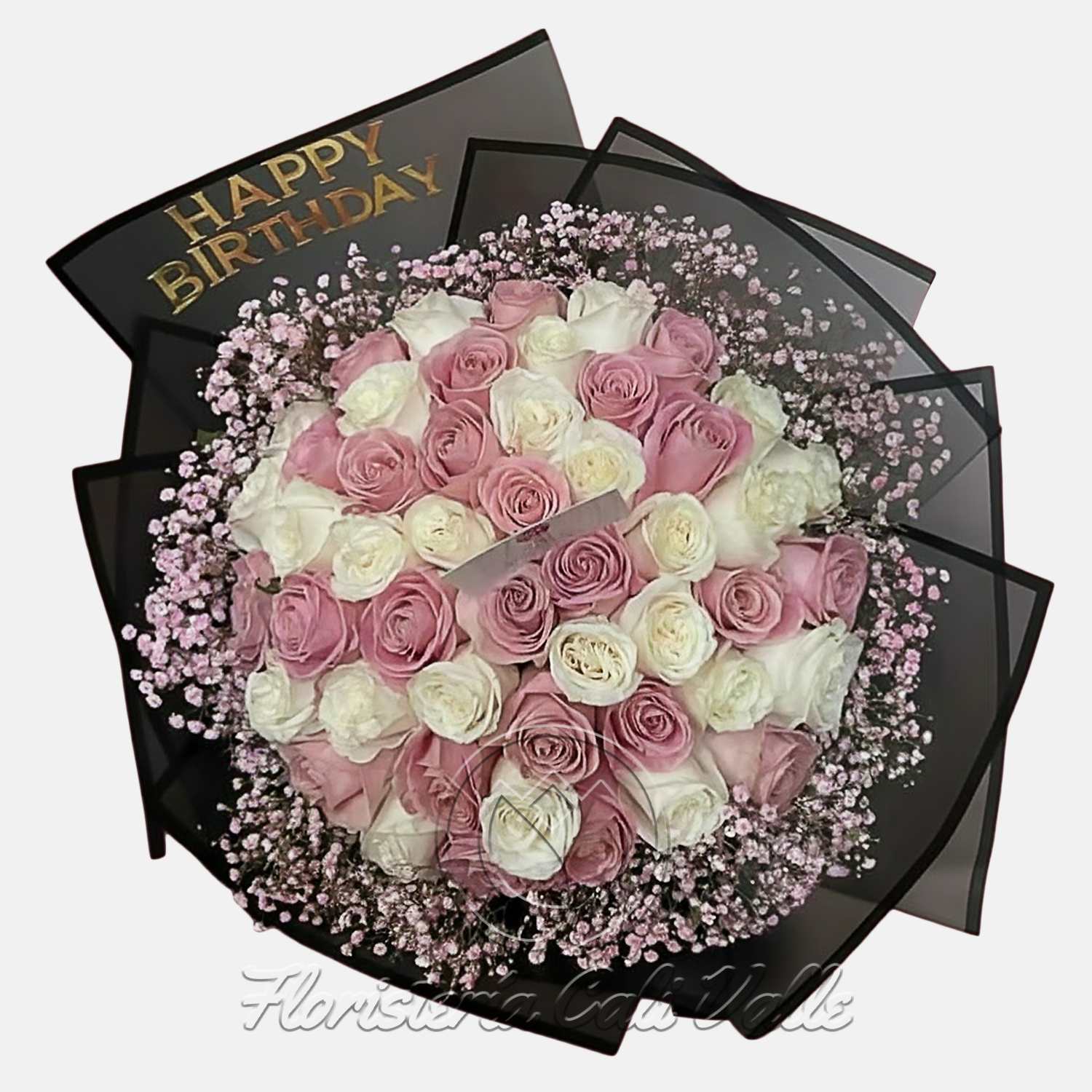 Este ramo es una celebración de elegancia y contraste, diseñado especialmente para un cumpleaños memorable. Se compone de un gran número de rosas en dos tonos principales: blanco puro y malva o rosa vintage (un tono rosa con toques de lavanda o grisáceo). La combinación crea un efecto visual sofisticado y muy apreciado. Las rosas están rodeadas por una gran cantidad de gypsophila (velo de novia) teñida en un delicado rosa pálido, que aporta una textura ligera y romántica al diseño. La presentación es moderna y dramática, utilizando papel de envoltura negro que contrasta fuertemente con los tonos suaves de las flores. La parte superior del envoltorio lleva la inscripción «HAPPY BIRTHDAY» en letras doradas, haciendo de este un regalo de cumpleaños audaz y lujoso.
