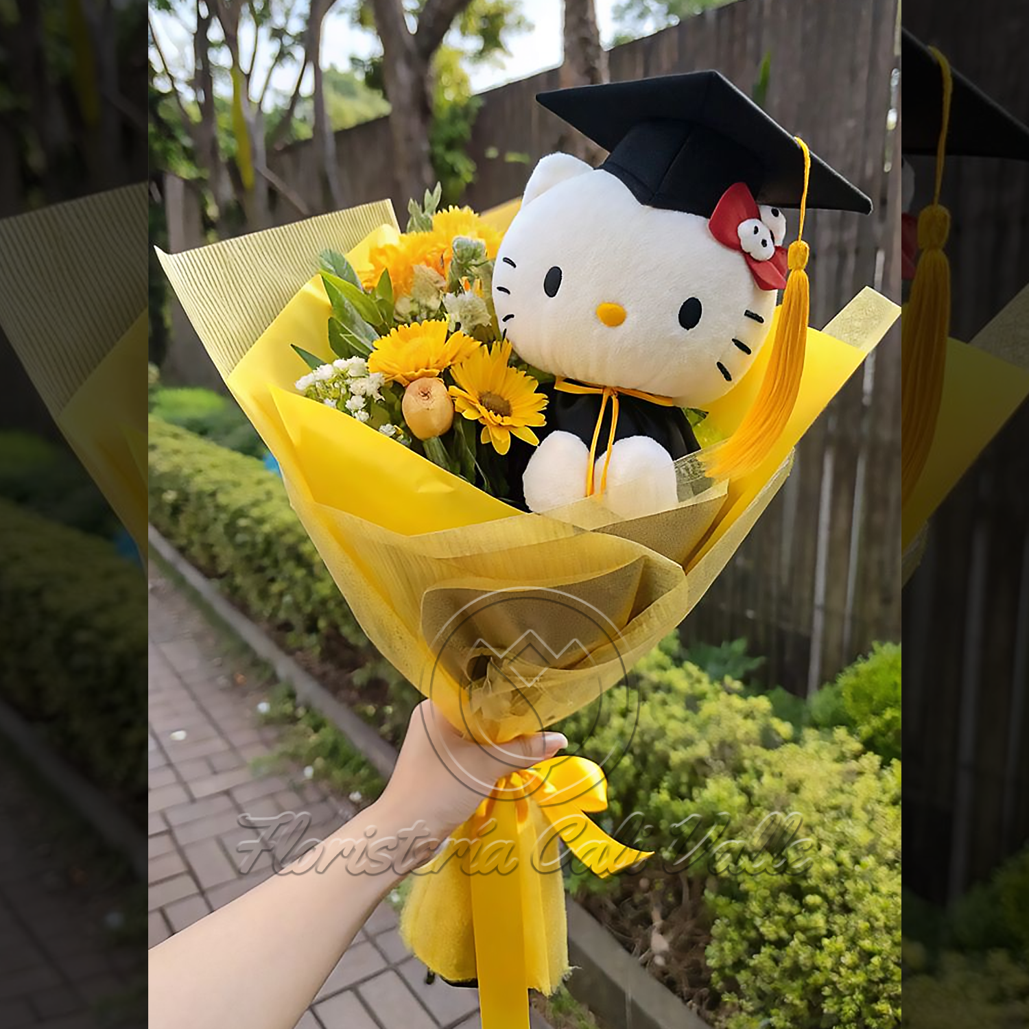 Este encantador ramo es el regalo perfecto para celebrar un logro de graduación. Combina la dulzura de un peluche de Hello Kitty vestida con toga y birrete (gorro de graduación) con la alegría y el simbolismo de las flores. El ramo está compuesto por una vibrante selección de girasoles —que representan la felicidad, la vitalidad y el éxito—, complementados con pequeños toques de follaje verde y otras flores blancas y amarillas de relleno para dar textura y volumen. Todo el conjunto está envuelto cuidadosamente en un papel de envoltura de color amarillo brillante y dorado, atado con un lazo del mismo tono, simbolizando la luz de un nuevo comienzo. Es un detalle memorable, lleno de ternura y celebración.