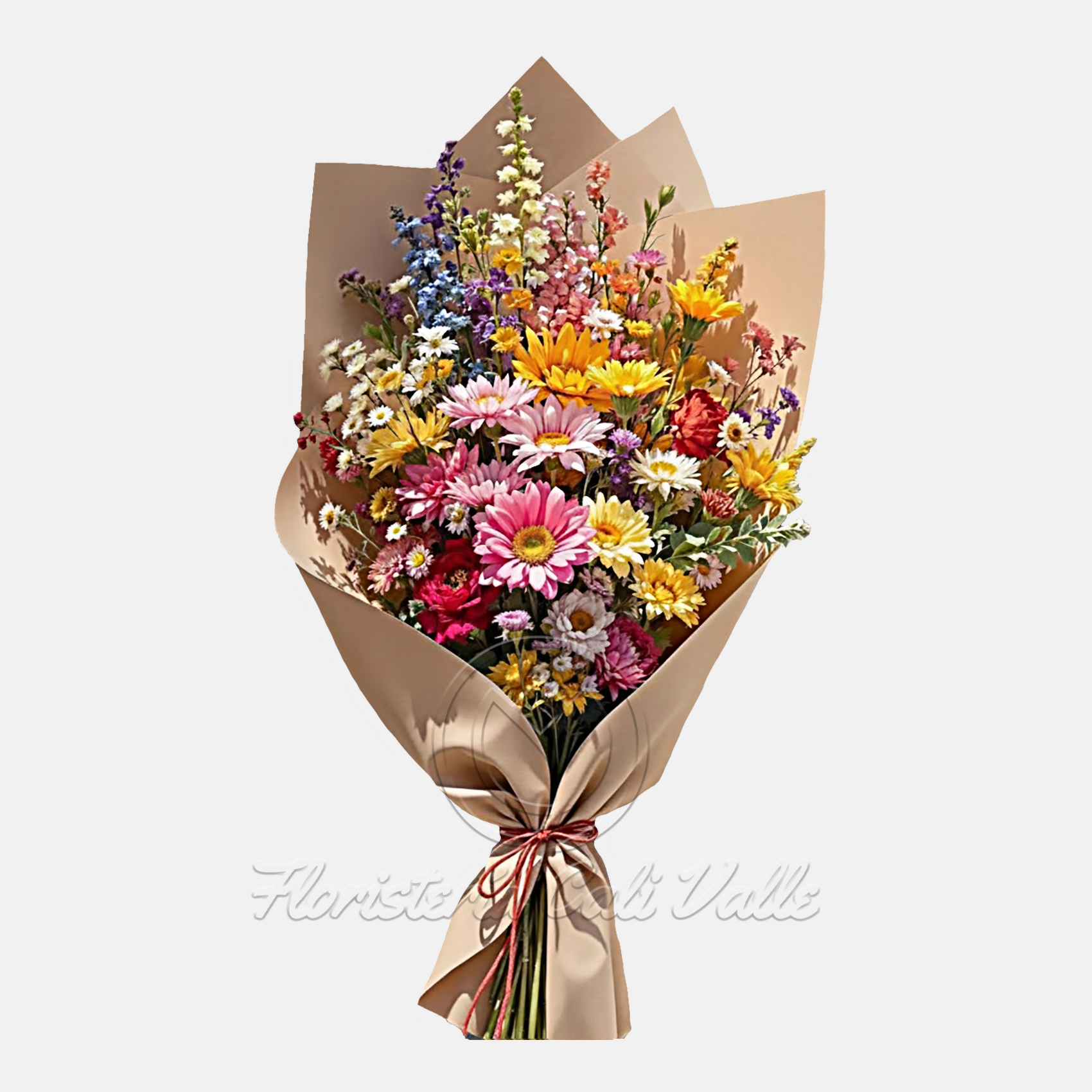Este vibrante ramo de estilo country o campestre es un estallido de alegría y color. Es un arreglo mixto que simula la abundancia y variedad de un prado de flores silvestres. La composición incluye una rica mezcla de flores como margaritas (en tonos fucsia, rosa pálido, y blanco con centros amarillos), girasoles pequeños, delphinium (con sus espigas azules y moradas), y otras flores de relleno en tonos rojos, amarillos, azules y rosados. La diversidad de formas y alturas le da un aspecto natural, fresco y desenfadado. Está envuelto en un papel kraft (papel de estraza) de color marrón natural, atado de forma sencilla con una cuerda rústica, lo que enfatiza el aire orgánico y artesanal del diseño. Es perfecto para celebrar la amistad, la vitalidad o para dar un toque de color a cualquier ocasión.