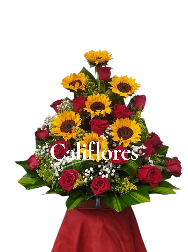 Ramo de flores mediano triangular, con girasoles y rosas rojas. 3176746727
