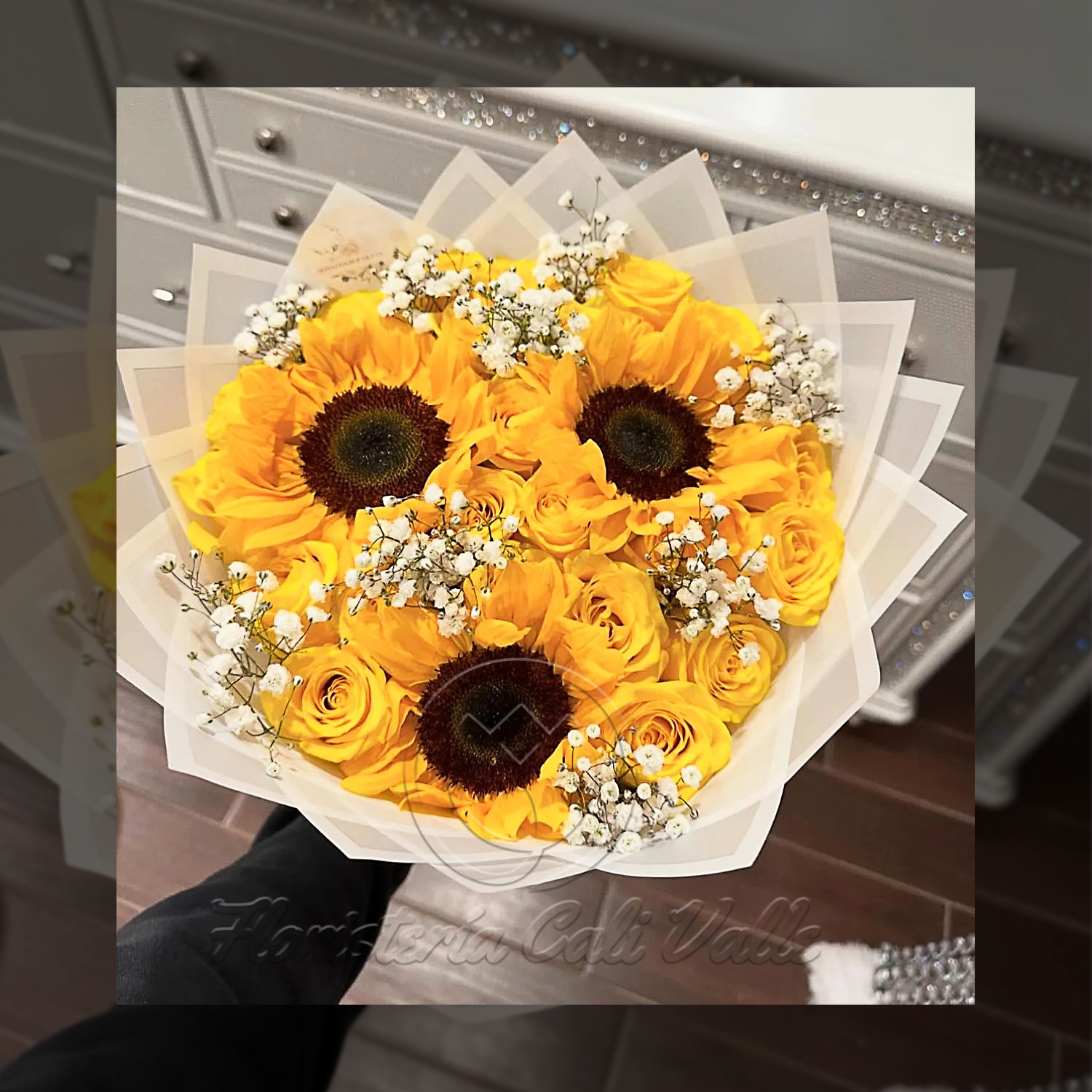 Un clásico y alegre ramo que irradia felicidad y optimismo. Compuesto por vibrantes y grandes girasoles de un intenso color amarillo, que simbolizan la adoración y la longevidad. Están delicadamente intercalados con la sutil belleza de la Gypsofila (baby’s breath) blanca, que aporta ligereza y contraste. El ramo está elegantemente envuelto en papel decorativo, creando un regalo impactante. Ideal para animar el día, celebrar un logro o expresar amistad.